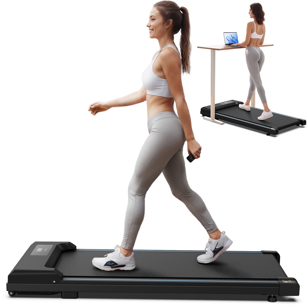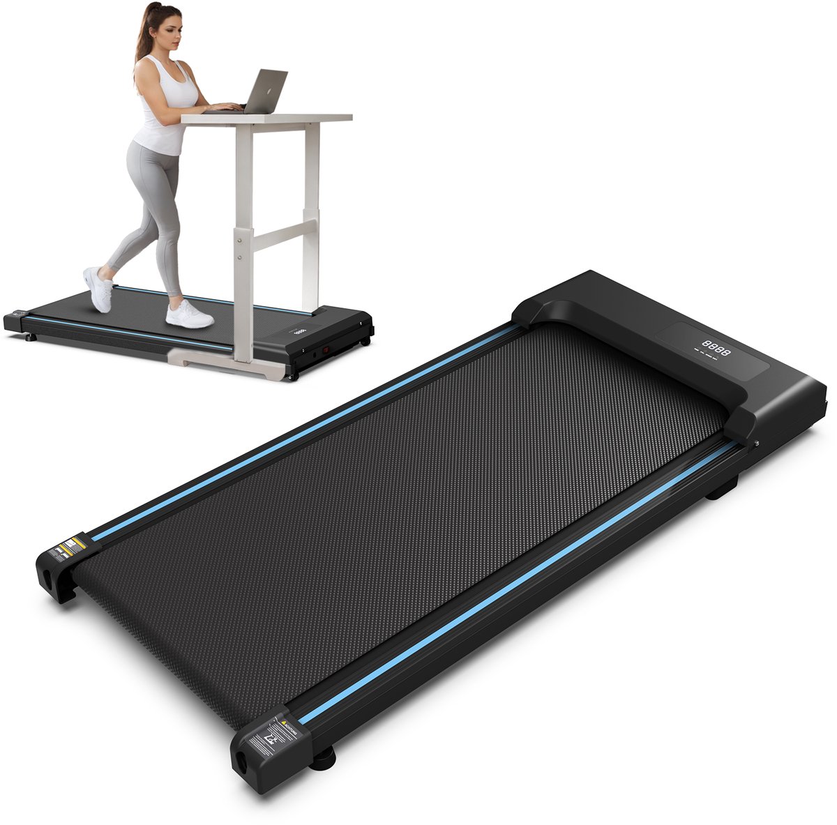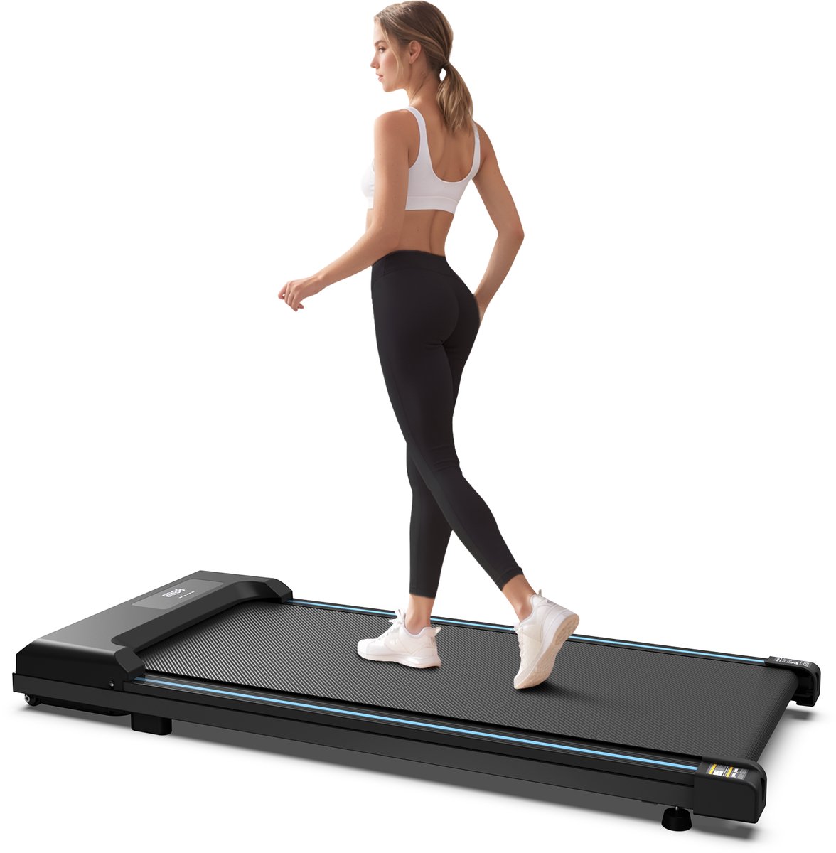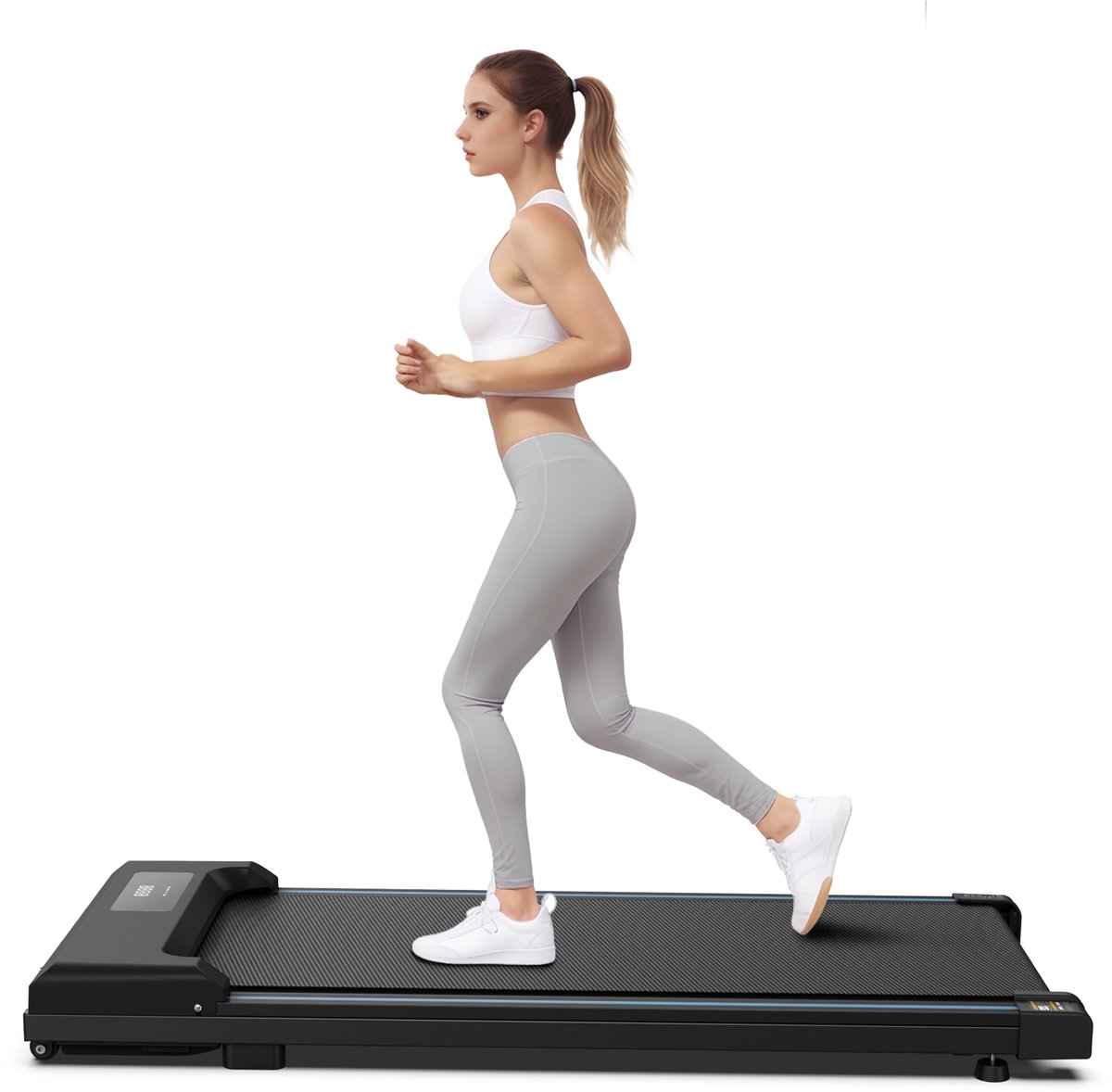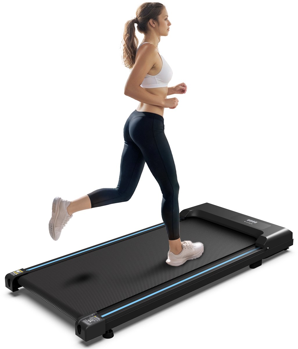 - Comfortabel en gebruiksvriendelijk design: De loopband zonder armsteunen heeft een compact profiel van slechts 10,5 cm hoog en is gemakkelijk op te stellen dankzij de afmetingen van 109 x 49 x 10,5 cm.