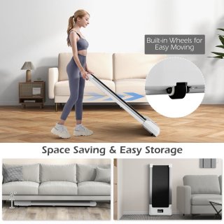- Compact en makkelijk op te bergen — Met een totale dikte van slechts 15 cm en ingebouwde transportwielen schuif je de loopband eenvoudig onder een bed of tegen de muur. Let op: de loopband is niet inklapbaar.
