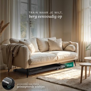 Het slanke, ruimtebesparende ontwerp zorgt dat de band slechts 10 cm hoog is. Je schuift hem eenvoudig onder een bed of bank en verplaatst hem dankzij de geïntegreerde transportwieltjes zonder moeite naar de gewenste plek. Met een productlengte van 121 cm en breedte van 48,5 cm past hij ook in kleinere woonruimtes en kantoorhoeken.