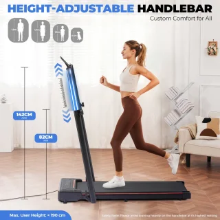 - Verstelbare, opklapbare handvatten – Perfect voor elk gezinslid: verschillende hoogtes, antislip bekleding voor extra veiligheid en een geïntegreerde telefoonhouder zodat je comfortabel kunt trainen en tegelijk kunt werken of entertainment kunt volgen.