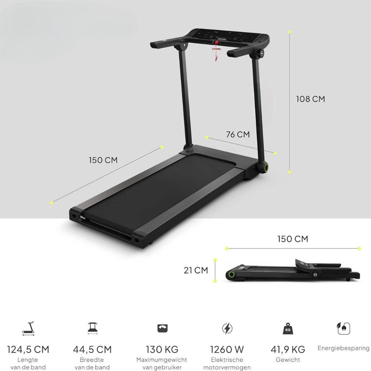 - Geschikt voor iedereen: Met een draagvermogen tot 130 kg en een lengte van 150 cm biedt deze loopband stabiliteit en comfort voor een breed scala aan gebruikers.