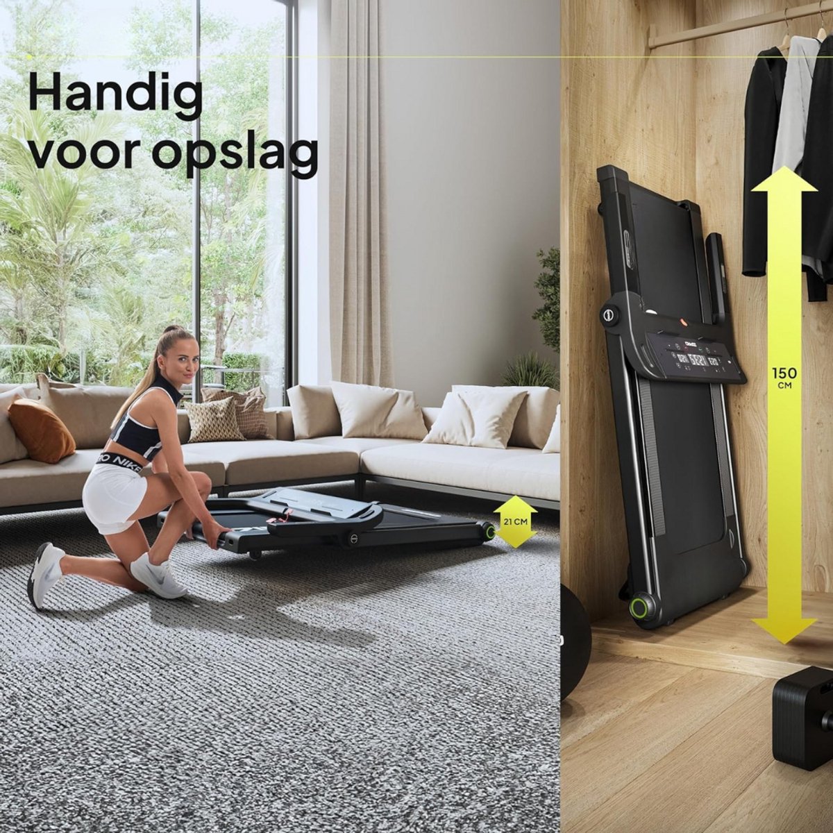 Door het slimme ontwerp en het compacte formaat past deze loopband perfect in kleinere woonruimtes. Na gebruik klap je hem gemakkelijk in en berg je hem op met de transportwielen, zodat hij nooit in de weg staat.
