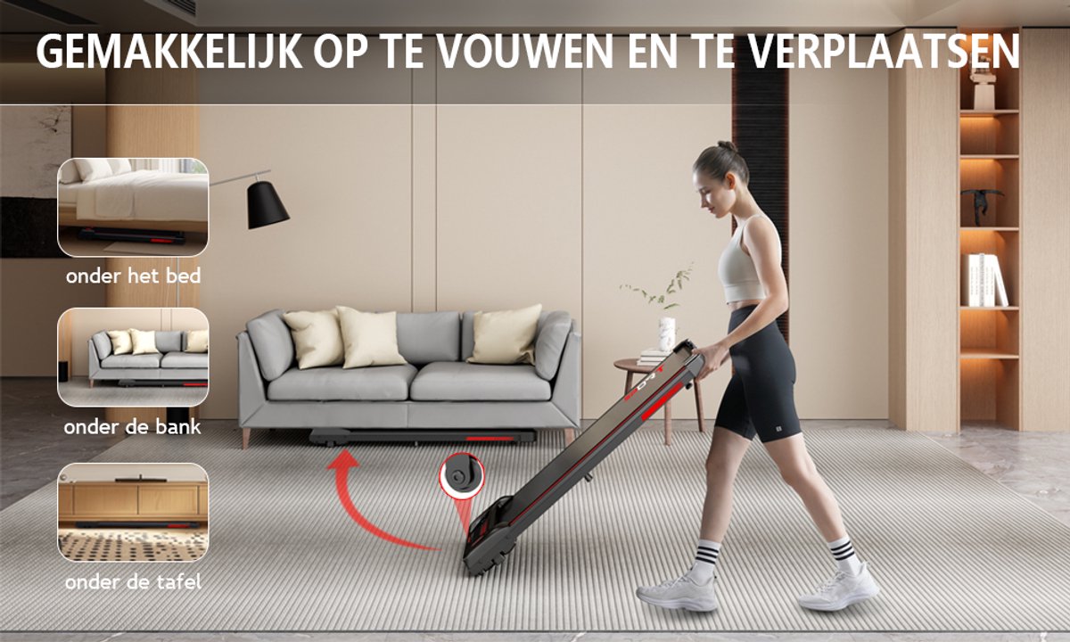 Dankzij het slanke en lichte design van slechts 16,4 kg en uitgerust met handige katrollen onderaan, is deze loopband eenvoudig op te bergen onder de bank of het bed. De geluidsarme motor zorgt dat je privacy en rust worden gewaarborgd, zodat je zonder geluidsoverlast kunt trainen op elk moment van de dag.