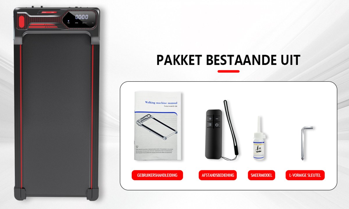 - Inbegrepen: loopband, afstandsbediening, handleiding, smeermiddel, sleutel